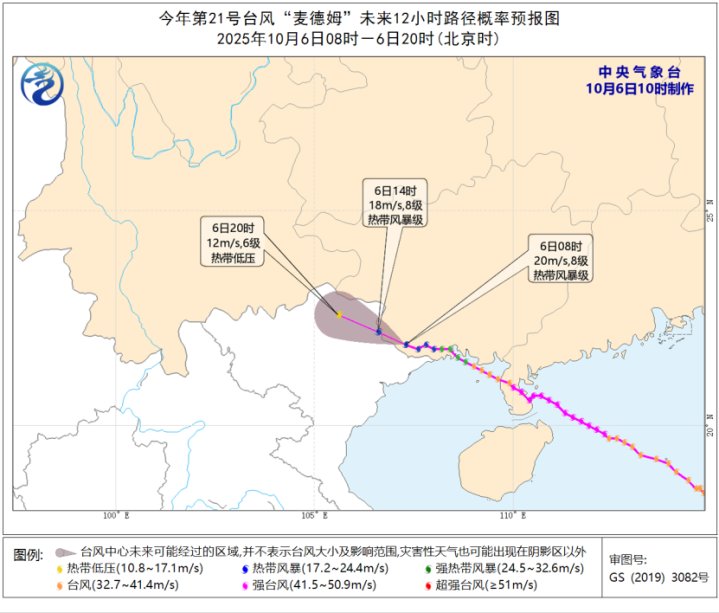 今年第21号台风“麦德姆”(热带风暴级)的中心今天(6日)上午8点钟位于广西崇左市境内,最大风力有8级(20米/秒)。预计,“麦德姆”将以每小时15~20公里的速度向西偏北方向移动,强度逐渐减弱。